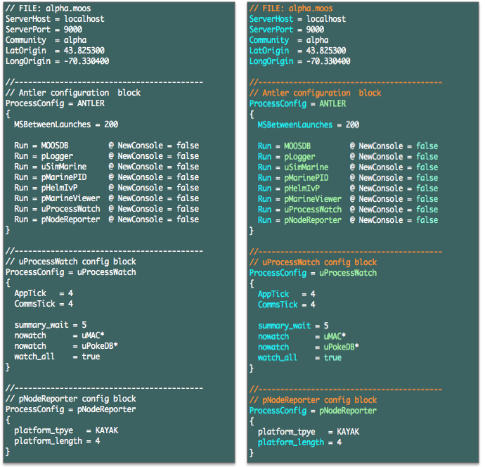 Figure 1.1: The MOOS Emacs Mode: One the left is a sample mission file without syntax highlighting. On the right, highlighting is enabled. Note the syntax error in the first line of pNodeReporter is more apparent.