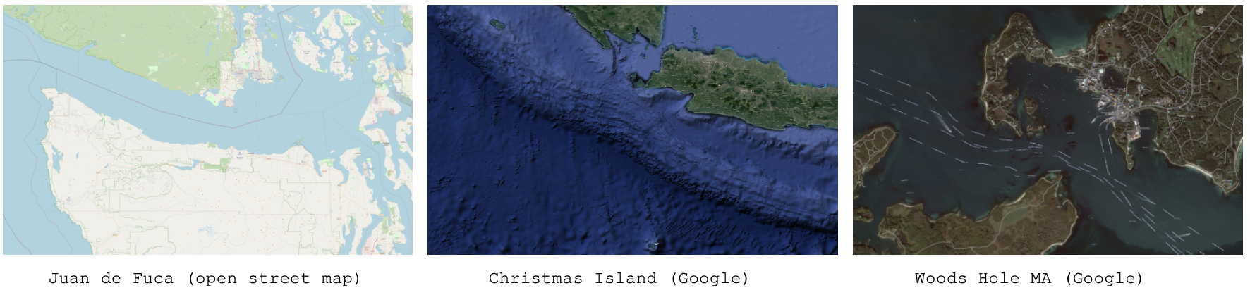 Figure 1.1: Example Background Region Images: The example images downloaded from freely available tile servers that may be utilized in either pMarineViewer or alogview.