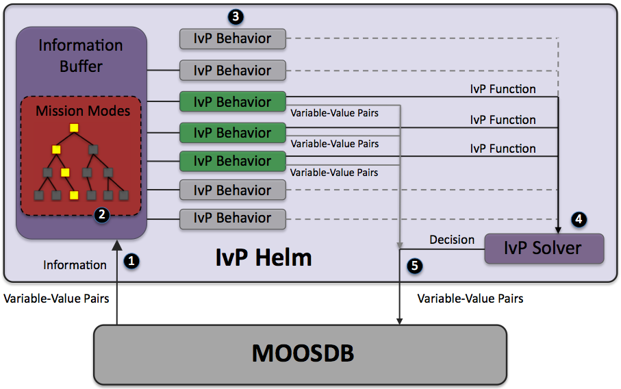 Figure 3.1: The Helm Iterate Loop: (1) Mail is read from the MOOSDB. It is parsed and stored in a local buffer to be available to the behaviors. (2) If there were any mode declarations in the mission behavior file, they are evaluated at this step. (3) Each behavior is queried for its contribution and may produce an IvP function and a list of variable-value pairs to be posted to the MOOSDB at the end of the iteration. (4) The objective functions are resolved to produce an action, expressible as a set of variable-value pairs. (5) All variable-value pairs are published to the MOOSDB for other MOOS processes to consume.