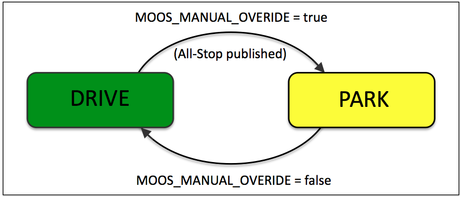 Figure 4.1: The Helm State of the IvP Helm: The helm state has a value of either PARK or DRIVE, depending on both how the helm is initialized and the mail received by the helm after start-up on the variable MOOS_MANUAL_OVERRIDE. The helm may also park itself if an all-stop event has been detected.
