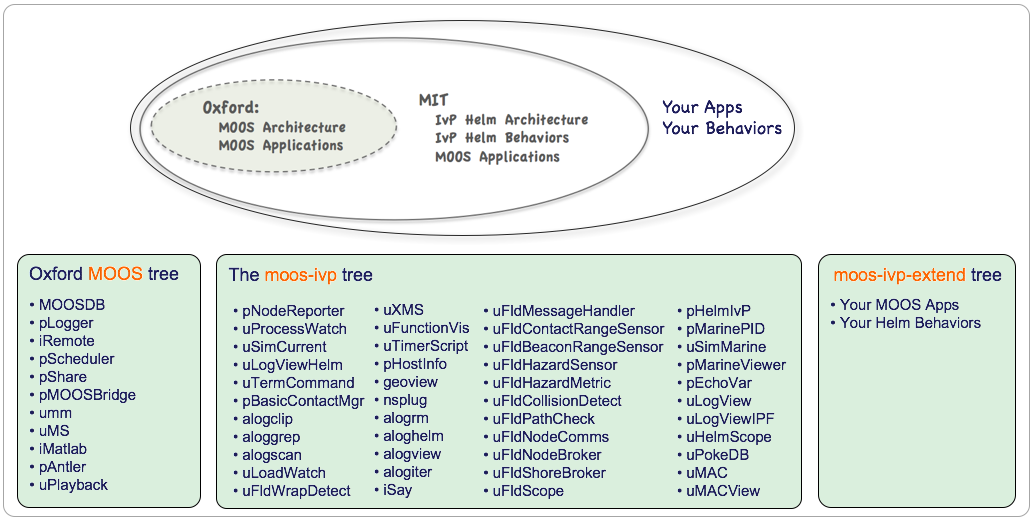 Figure 1.1: Nested Repositories: The MOOS-IvP tree contains the Oxford MOOS tree and additional modules from MIT including the Helm architecture, Helm behaviors and further MOOS applications. The set of modules may be expanded with user third-party applications or behaviors.