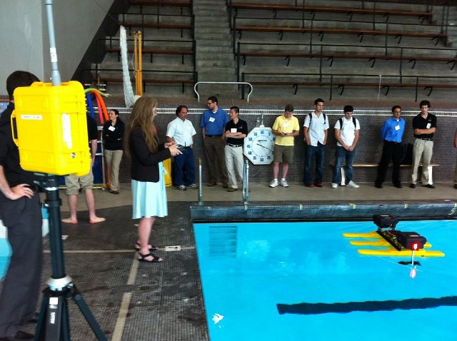 Dr. Signe Redfield from ONR Global tries the Kingfisher USV in the MIT Alumni Pool at MOOS-DAWG’11