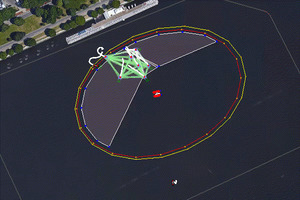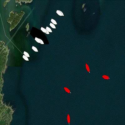 Figure 6.2: A group of defending Heron USVs defend a WAM-V high value unit (HVU) from two intruders - one was a human operated launch boat. There are two defending zones established using BHV_Voronoi, an outside patrol area, and a closer loiter region. The Herons decide as a group using pOpinionManager which of them should patrol vs loiter. When an intruder enters the patrol area a third team is formed, the interceptors, and the targets are allocated using pGroupComboAlloc. Log data from demonstration at MOOS-DAWG 23.