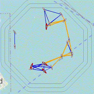 Figure 3.1: 18 vehicles use a decentralized algorithm to determine the global graph structure even though they can only communicate with local neighbors. Orange links indicate critical links as determined locally by the vehicle; these links are the only path for some vehicles to communicate with the larger group. The active network maintenance behavior, BHV_MaintainNetwork seeks to support these critical links. The collective motion of the group is governed by a flocking behavior (Boids algorithm).