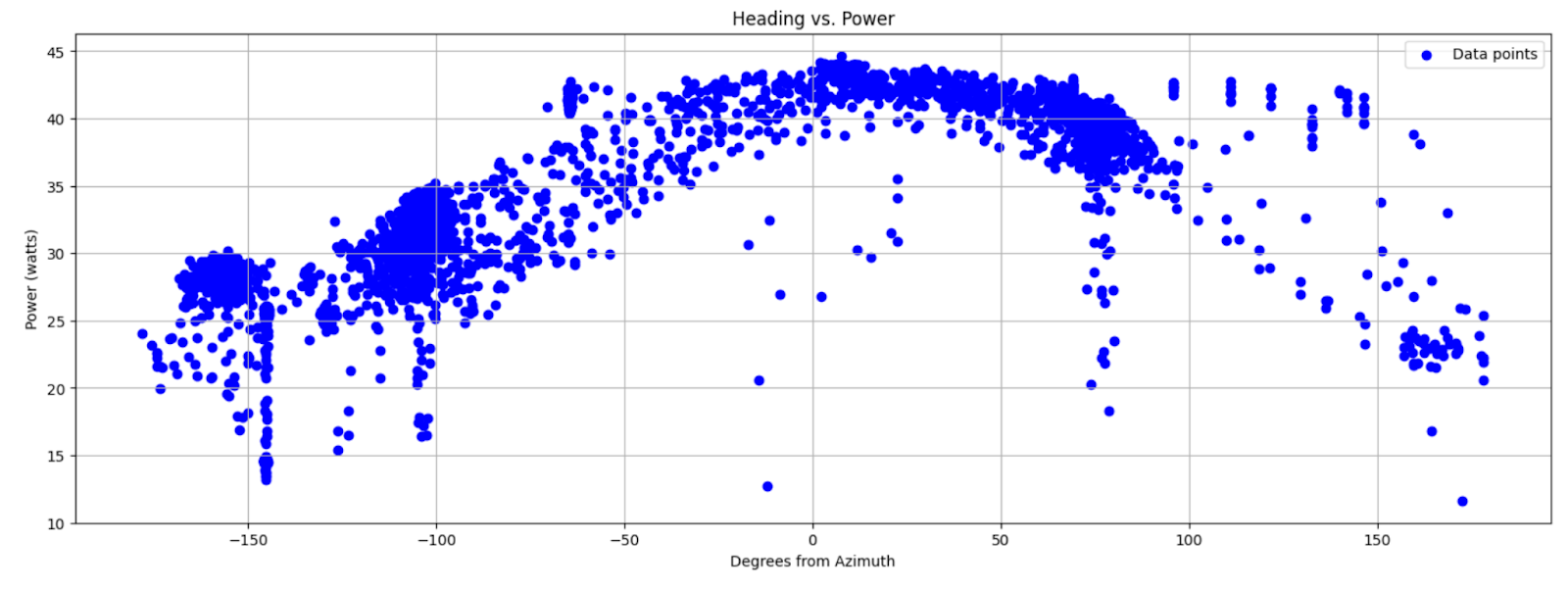 Figure 1.2: Relationship between ASV heading relative to solar azimuth and measured 50W solar panel power input, showing a cosine dependence.