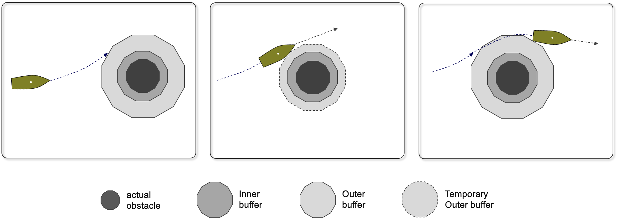 Figure 1.2: The AvoidObstacle Behavior: The behavior reasons about a single convex polygon obstacle. It uses an inner buffer and outer buffer, treating the inner buffer as essentially an extension of the obstacle, and the outer buffer as a region where it is preferred not to be in.