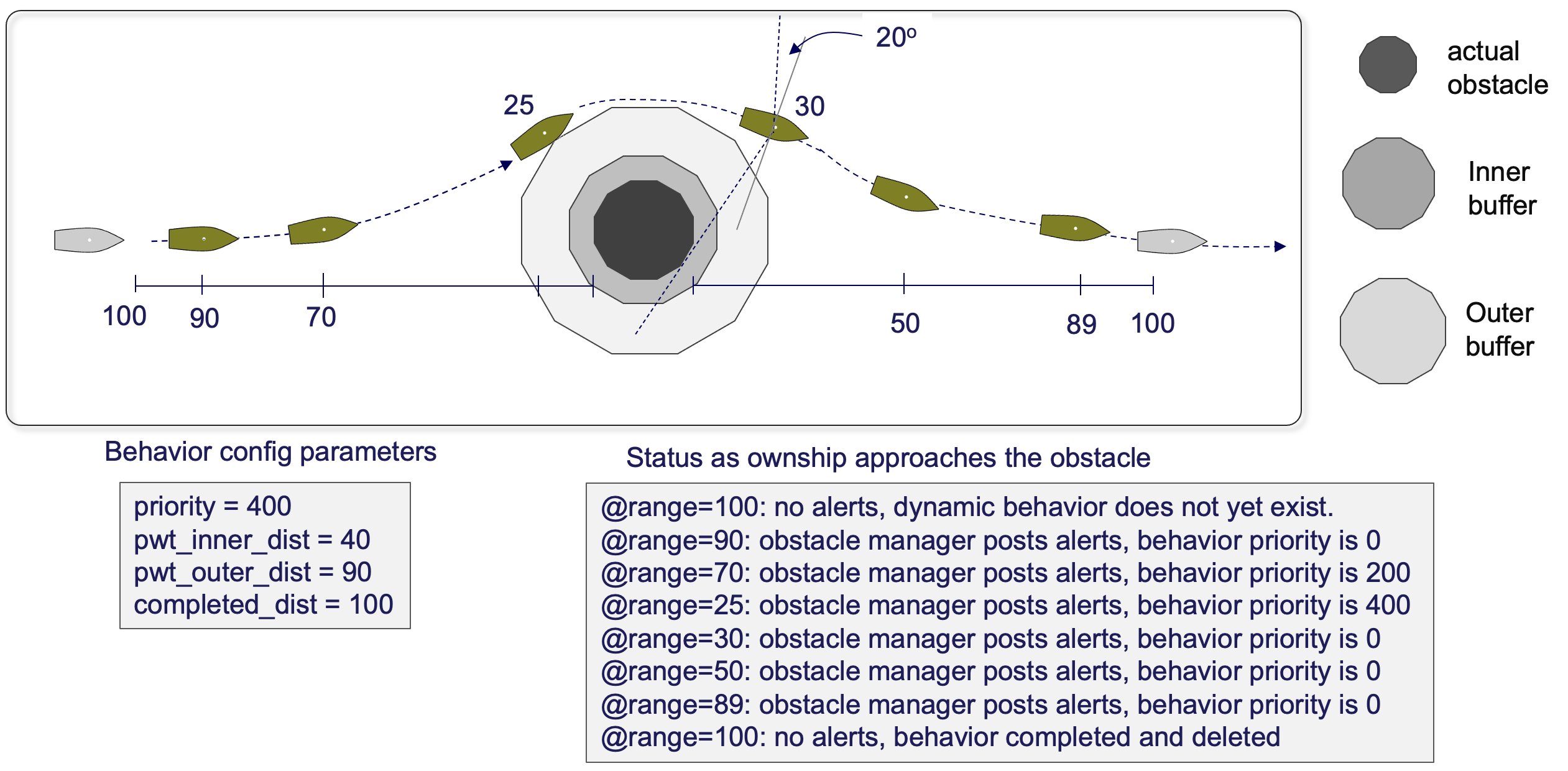 The AvoidObstacle behavior may be configured to increase its priority as it closes range to the obstacle. The priority weight specified in its configuration represents the maximum possible priority applied to the behavior, presumably in close range to the obstacle. The range at which this maximum priority applies is specified in the pwt_inner_dist parameter. Likewise, the pwt_outer_dist parameter specifies a range to the obstacle where the priority weight becomes zero, regardless of the priority weight specified in the configuration file.