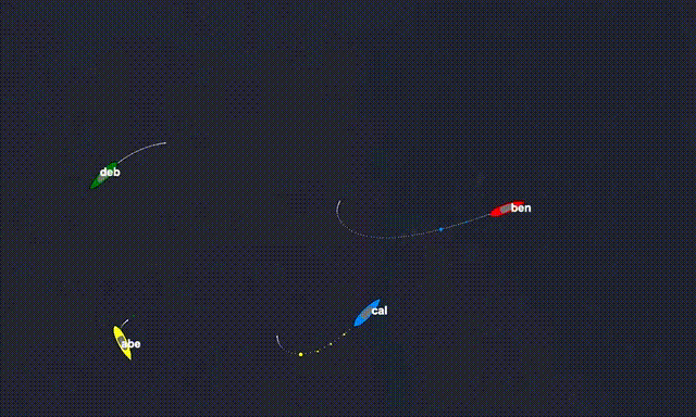 | Description: | Four convoying vehicles use the Muster behavior to inhabit a shared region |